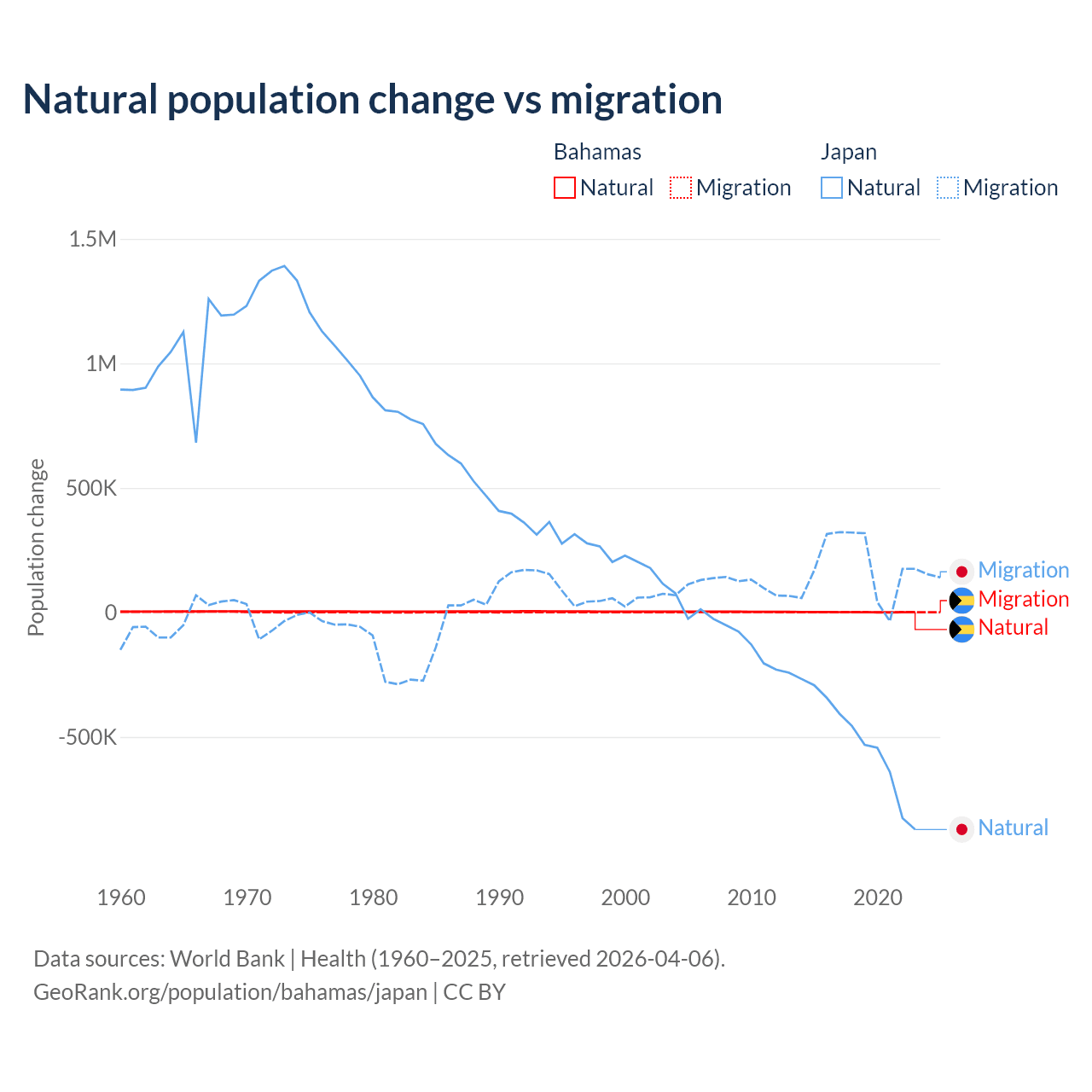 Over the last 10 years, 56.9% of the population change in the Bahamas is from natural causes (a gain of 11,209 people) and 43.1% is from migration (a gain of 8,495 people). In Japan 73.6% is from natural causes (a loss of 5,178,838 people) and 26.4% is from migration (a gain of 1,860,103 people).
