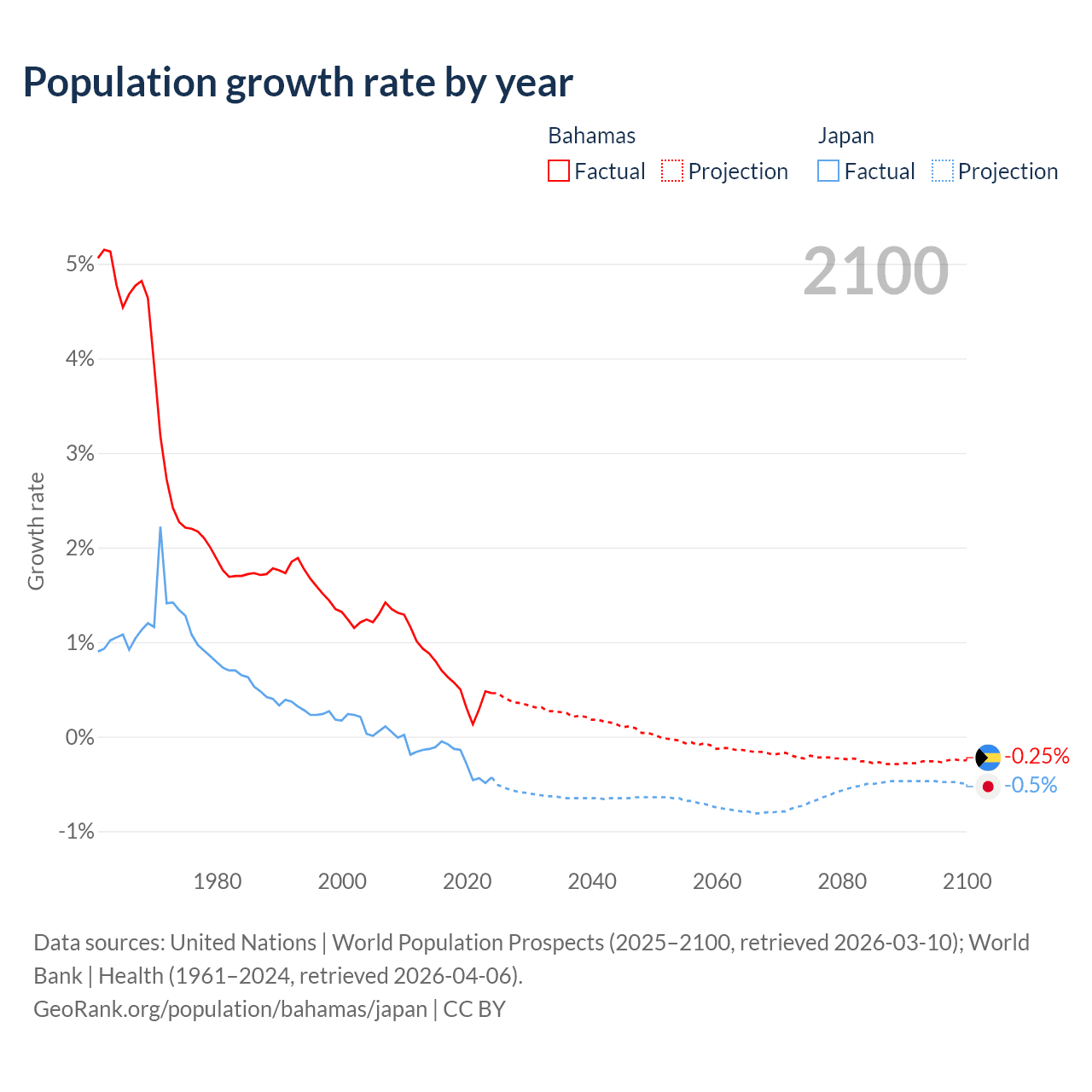 - For the last 10 years, the Bahamas has had an average growth rate of +0.52% per year vs -0.25% in Japan.