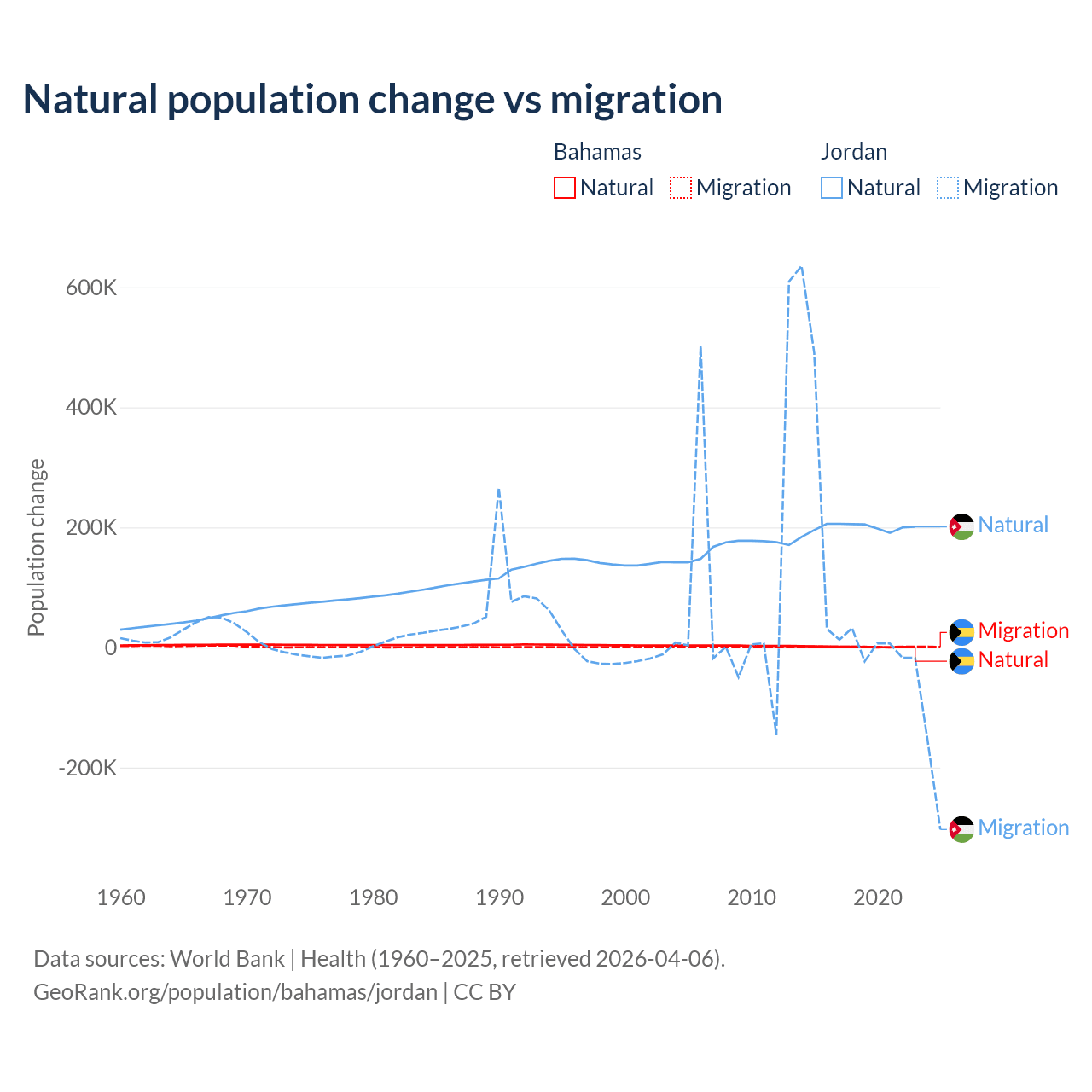 Over the last 10 years, 56.9% of the population change in the Bahamas is from natural causes (a gain of 11,209 people) and 43.1% is from migration (a gain of 8,495 people). In Jordan 63.2% is from natural causes (a gain of 1,991,452 people) and 36.8% is from migration (a gain of 1,157,625 people).
