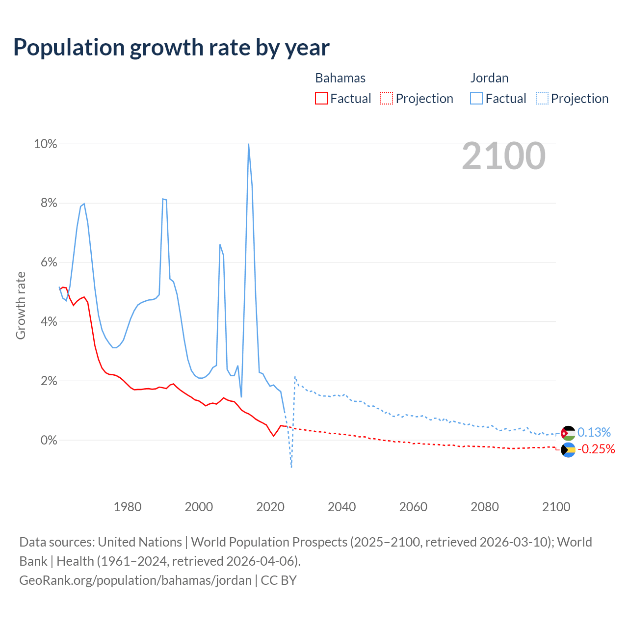 - For the last 10 years, the Bahamas has had an average growth rate of +0.52% per year vs +3.45% in Jordan.