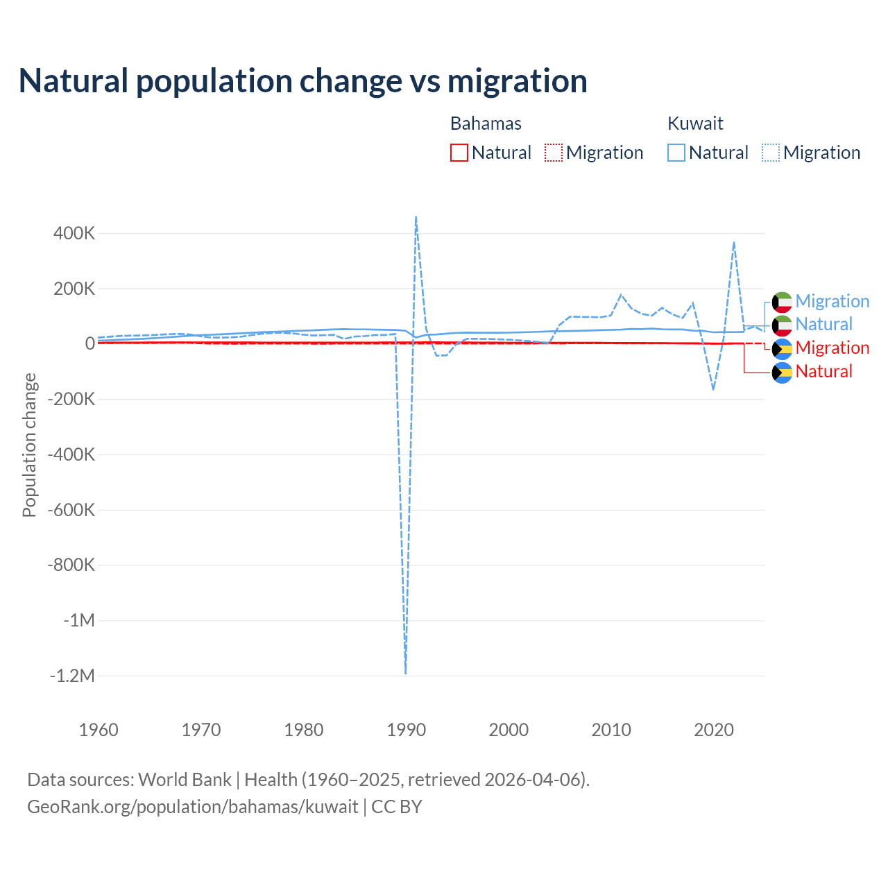 Over the last 10 years, 56.9% of the population change in the Bahamas is from natural causes (a gain of 11,209 people) and 43.1% is from migration (a gain of 8,495 people). In Kuwait 35.8% is from natural causes (a gain of 470,645 people) and 64.2% is from migration (a gain of 845,142 people).