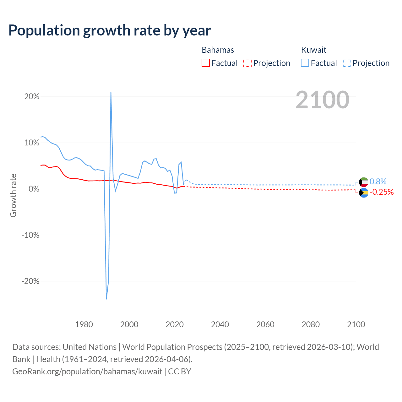 - For the last 10 years, the Bahamas has had an average growth rate of +0.52% per year vs +3.1% in Kuwait.