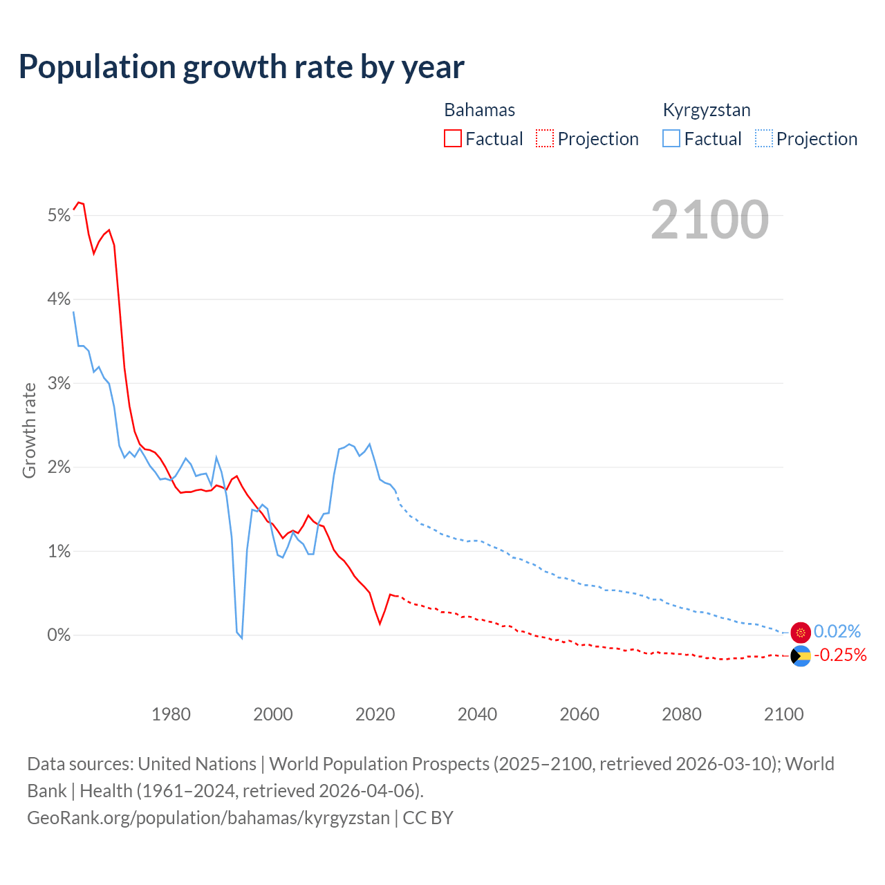 Data sources: World Bank | Health (1960–2024, retrieved 2026-04-06); United Nations | World Population Prospects (1960–2026, retrieved 2026-03-10); U.S. Census Bureau (1960–2025, retrieved 2026-02-08); Central Intelligence Agency (CIA) (2000–2019, retrieved 2026-02-20).