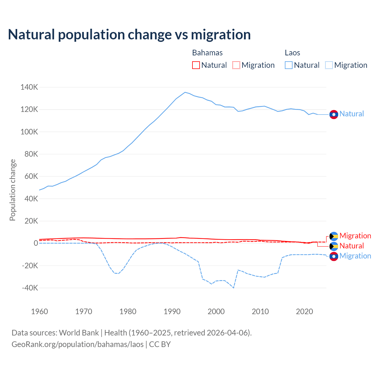 Over the last 10 years, 56.9% of the population change in the Bahamas is from natural causes (a gain of 11,209 people) and 43.1% is from migration (a gain of 8,495 people). In Laos 90.6% is from natural causes (a gain of 1,183,013 people) and 9.41% is from migration (a loss of 122,899 people).
