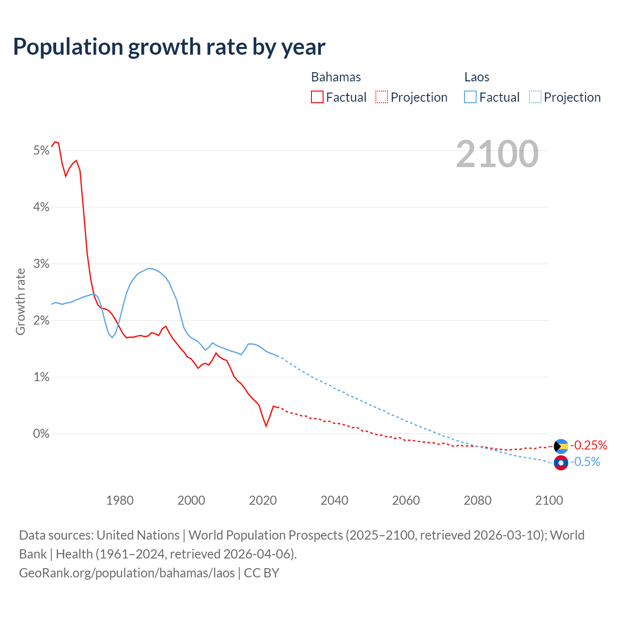 - For the last 10 years, the Bahamas has had an average growth rate of +0.52% per year vs +1.48% in Laos.