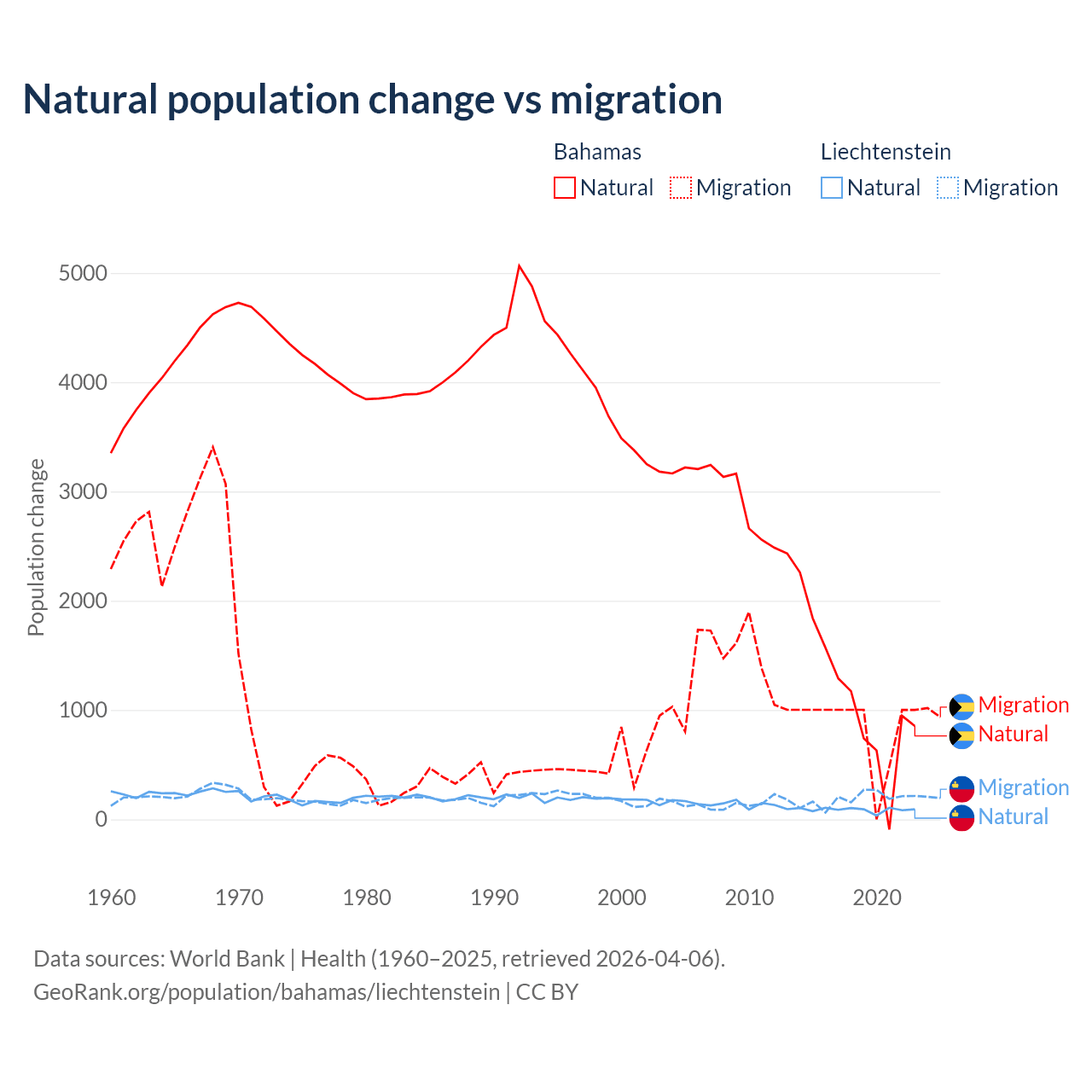 Over the last 10 years, 56.9% of the population change in the Bahamas is from natural causes (a gain of 11,209 people) and 43.1% is from migration (a gain of 8,495 people). In Liechtenstein 32.4% is from natural causes (a gain of 883 people) and 67.6% is from migration (a gain of 1,843 people).