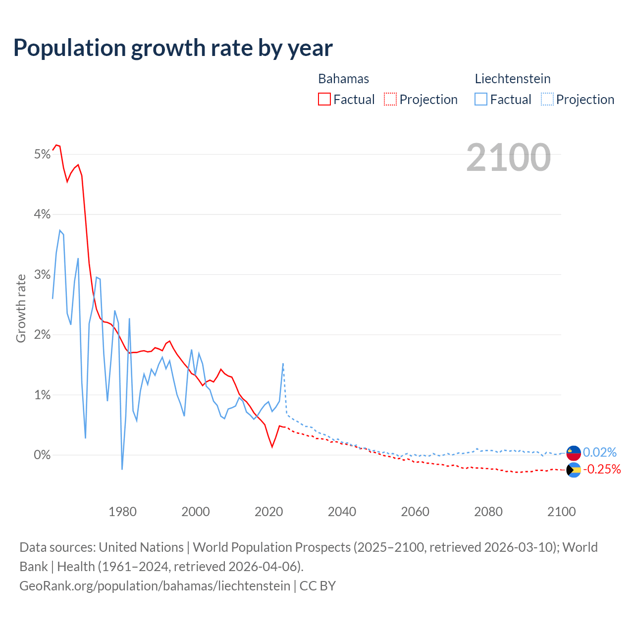 - For the last 10 years, the Bahamas has had an average growth rate of +0.52% per year vs +0.82% in Liechtenstein.