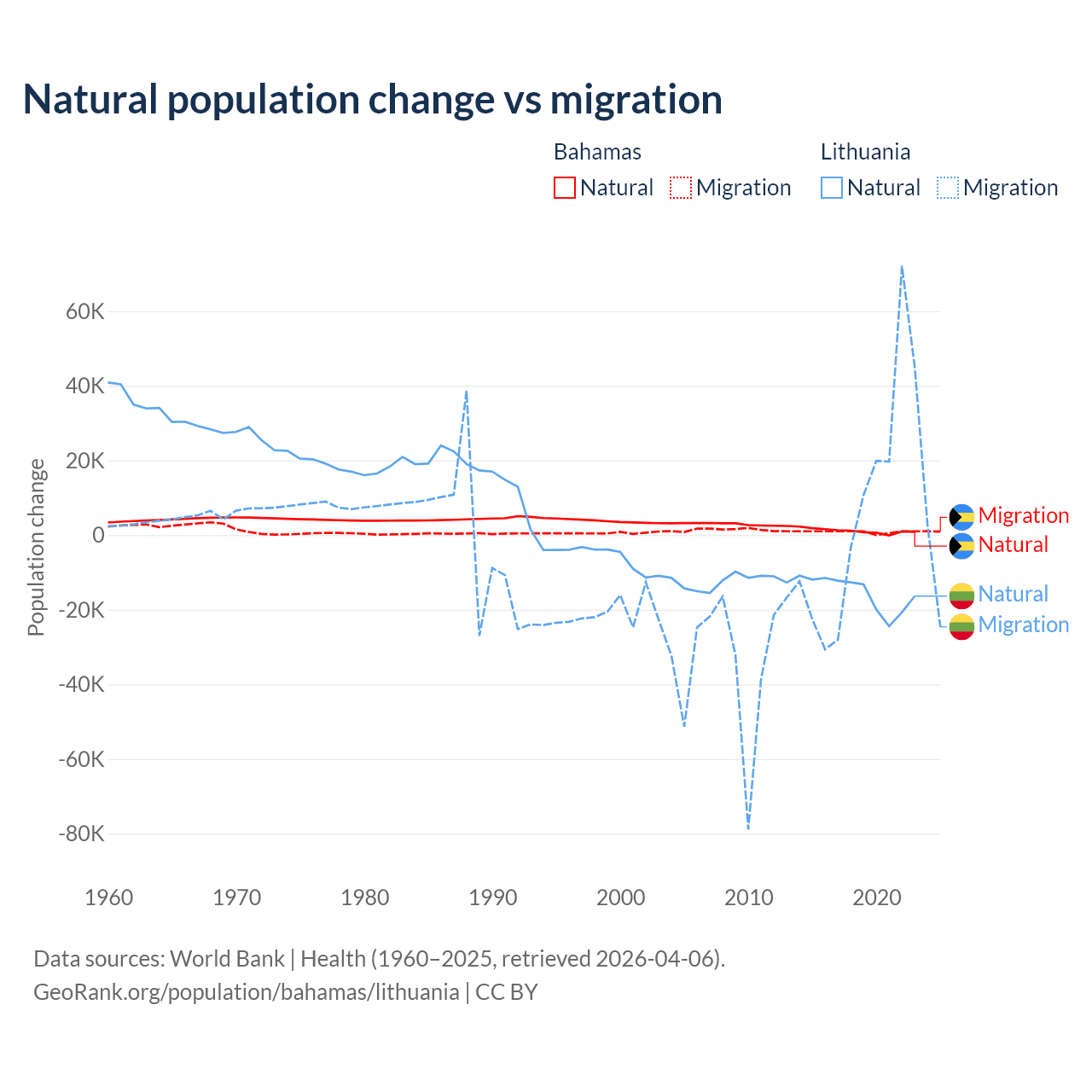 Over the last 10 years, 56.9% of the population change in the Bahamas is from natural causes (a gain of 11,209 people) and 43.1% is from migration (a gain of 8,495 people). In Lithuania 68.7% is from natural causes (a loss of 153,859 people) and 31.3% is from migration (a gain of 70,196 people).