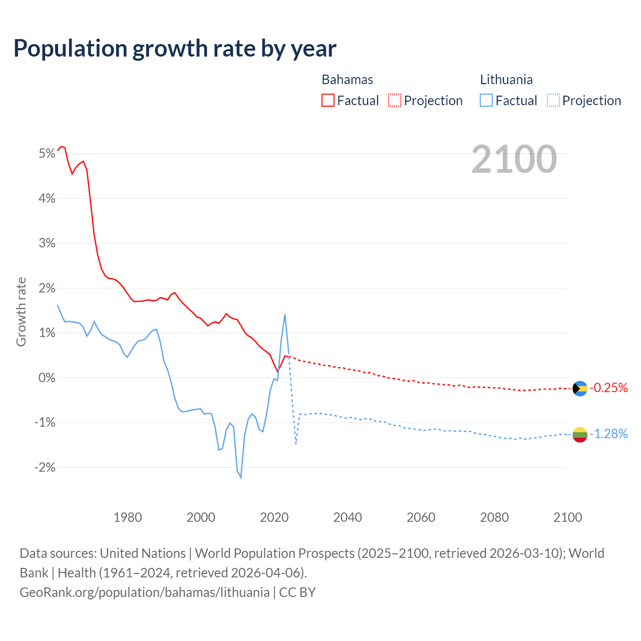 - For the last 10 years, the Bahamas has had an average growth rate of +0.52% per year vs -0.22% in Lithuania.