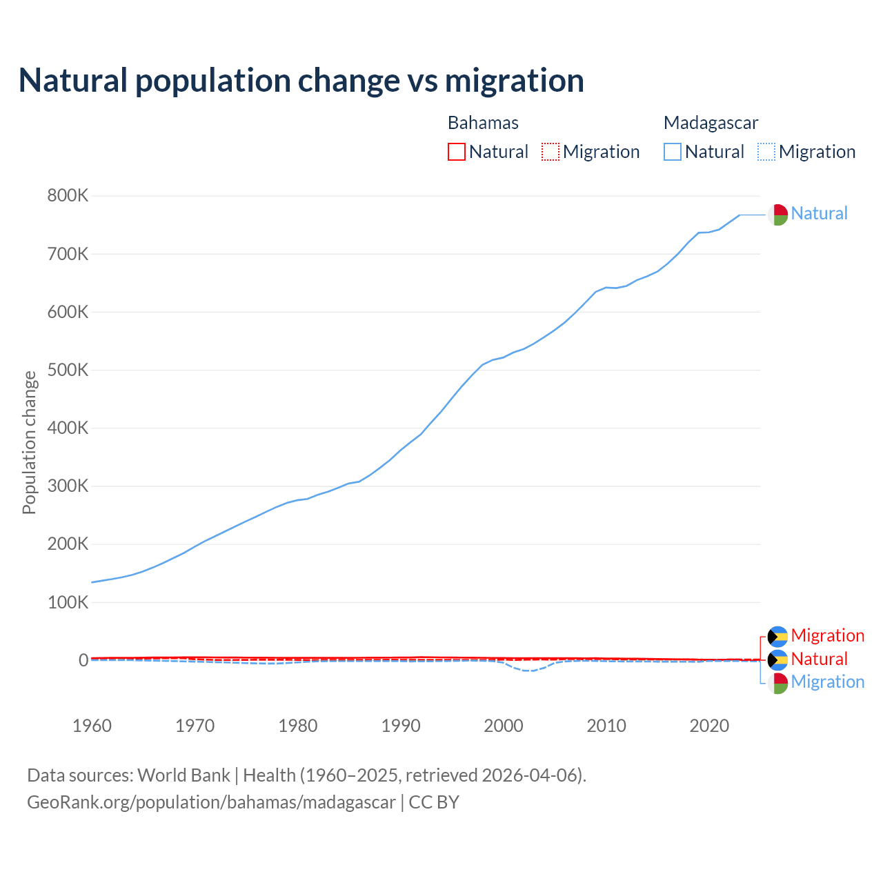Over the last 10 years, 56.9% of the population change in the Bahamas is from natural causes (a gain of 11,209 people) and 43.1% is from migration (a gain of 8,495 people). In Madagascar 99.7% is from natural causes (a gain of 7,165,578 people) and 0.31% is from migration (a loss of 22,384 people).