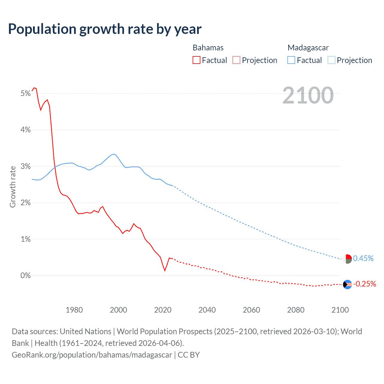 - For the last 10 years, the Bahamas has had an average growth rate of +0.52% per year vs +2.6% in Madagascar.