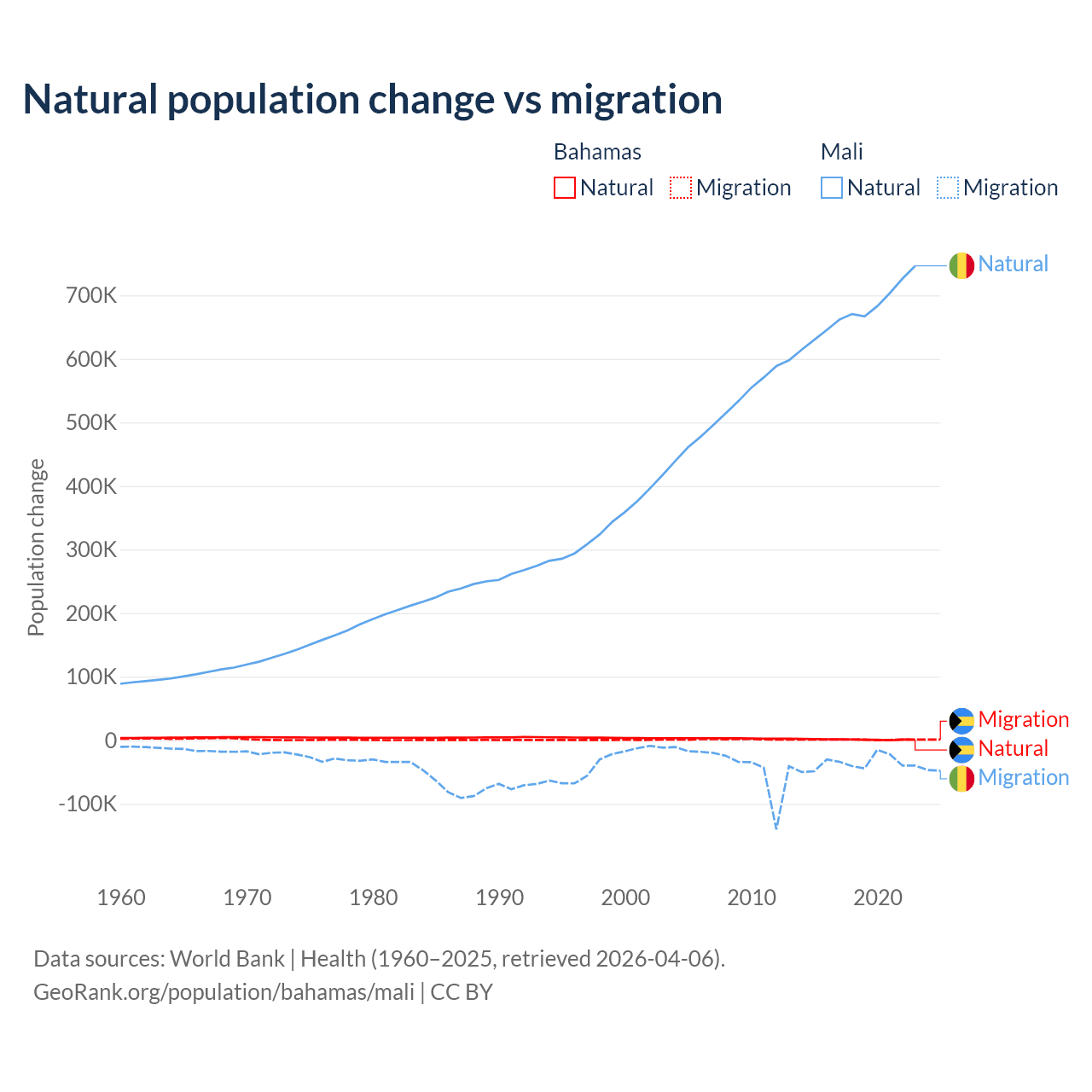 Over the last 10 years, 56.9% of the population change in the Bahamas is from natural causes (a gain of 11,209 people) and 43.1% is from migration (a gain of 8,495 people). In Mali 94.9% is from natural causes (a gain of 6,749,473 people) and 5.13% is from migration (a loss of 365,292 people).