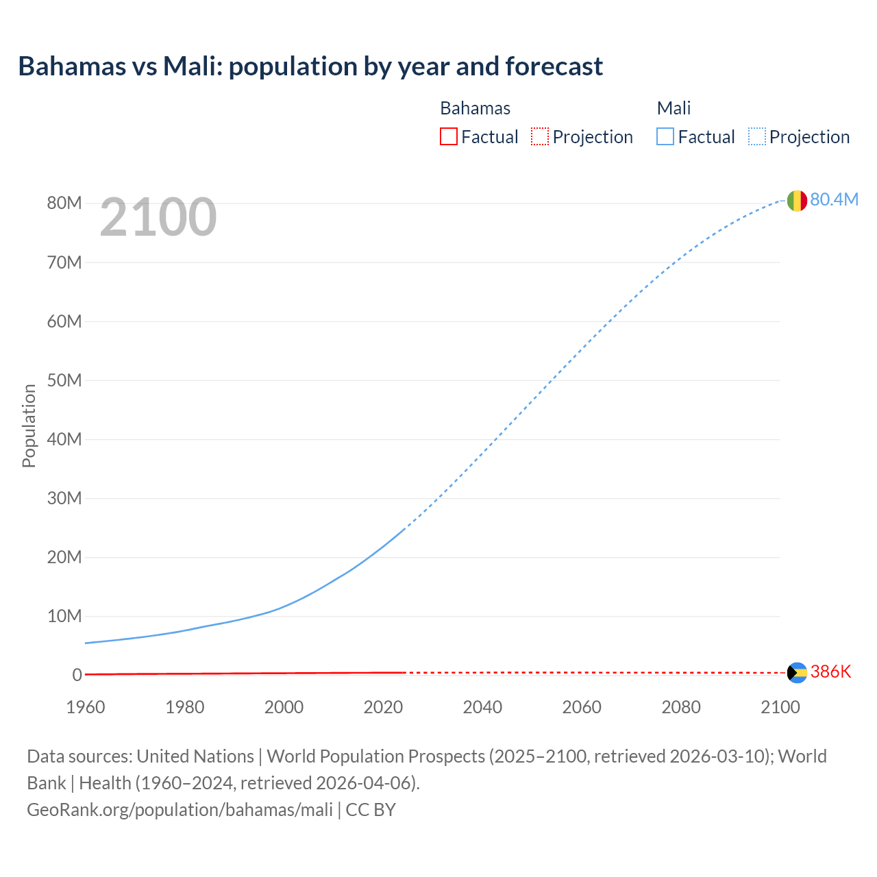 Bahamas vs Mali: population by year and forecast