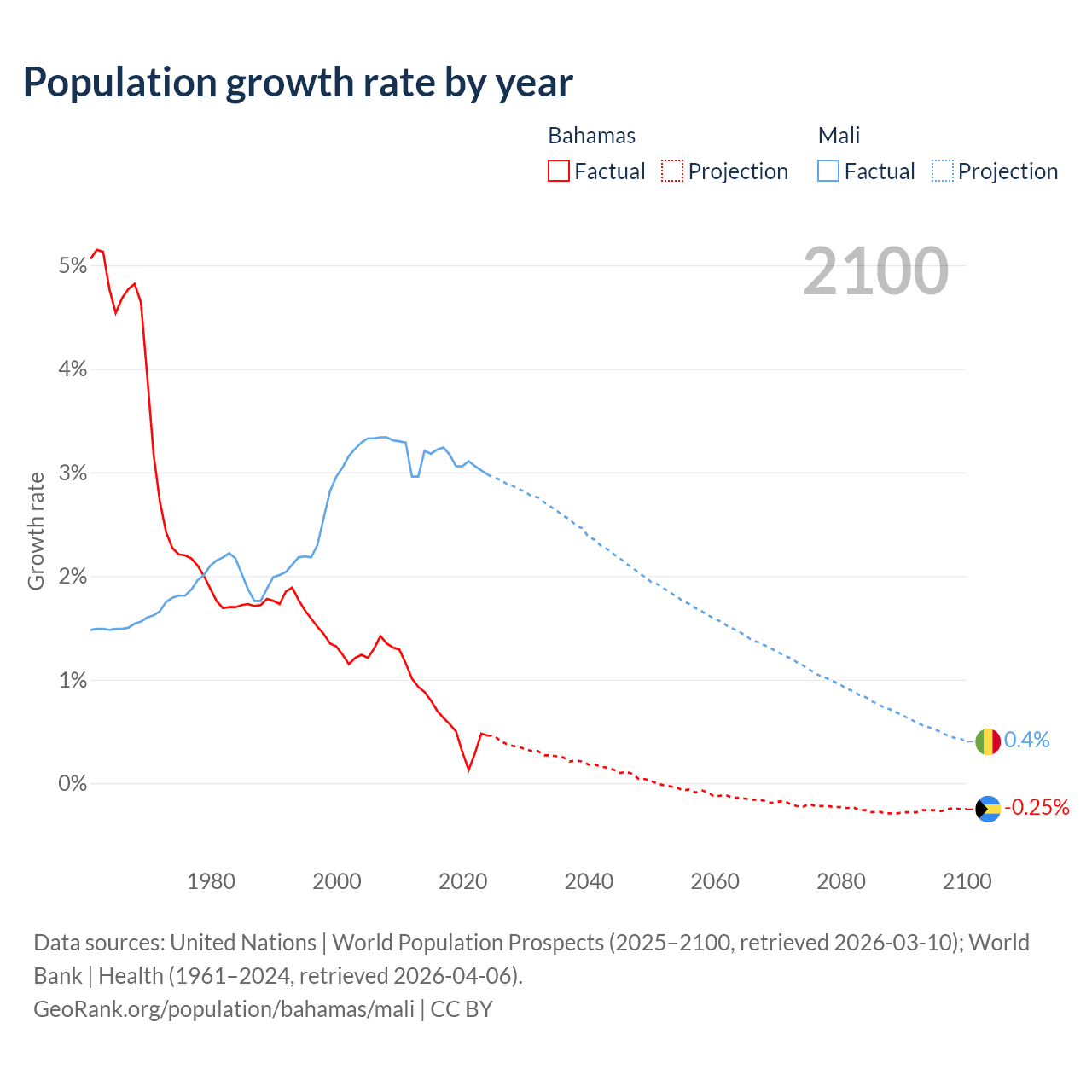 - For the last 10 years, the Bahamas has had an average growth rate of +0.52% per year vs +3.12% in Mali.
