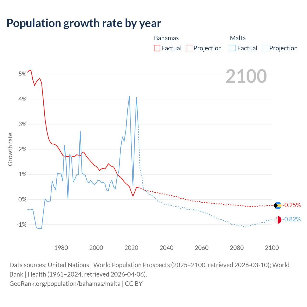 - For the last 10 years, the Bahamas has had an average growth rate of +0.52% per year vs +2.69% in Malta.