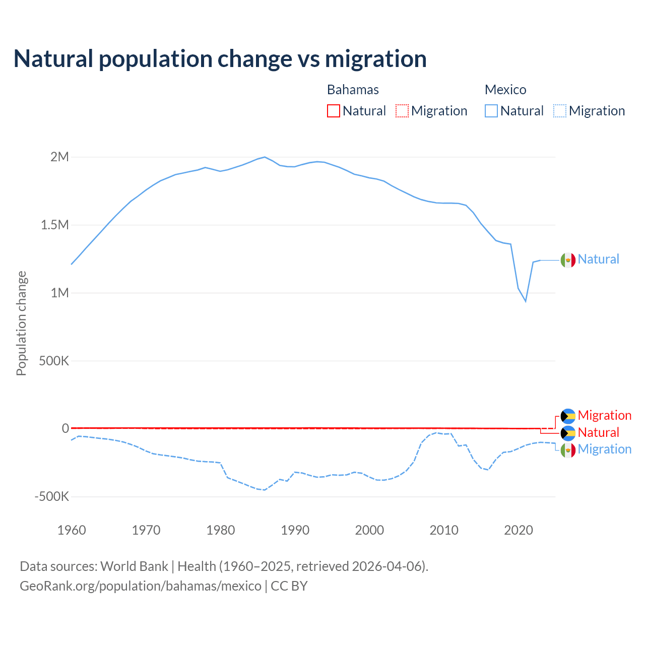 Over the last 10 years, 56.9% of the population change in the Bahamas is from natural causes (a gain of 11,209 people) and 43.1% is from migration (a gain of 8,495 people). In Mexico 87.5% is from natural causes (a gain of 13,080,136 people) and 12.5% is from migration (a loss of 1,876,544 people).