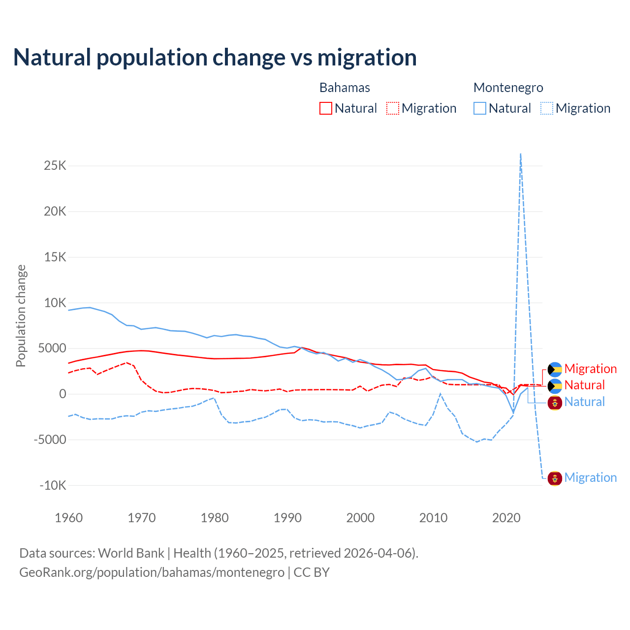Over the last 10 years, 56.9% of the population change in the Bahamas is from natural causes (a gain of 11,209 people) and 43.1% is from migration (a gain of 8,495 people). In Montenegro 52.4% is from natural causes (a gain of 4,501 people) and 47.6% is from migration (a gain of 4,095 people).