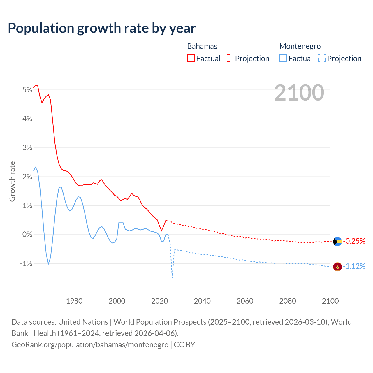 - For the last 10 years, the Bahamas has had an average growth rate of +0.52% per year vs +0.01% in Montenegro.