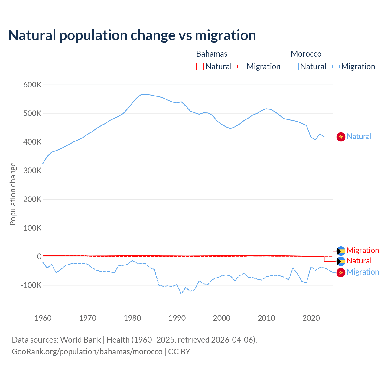 Over the last 10 years, 56.9% of the population change in the Bahamas is from natural causes (a gain of 11,209 people) and 43.1% is from migration (a gain of 8,495 people). In Morocco 88.3% is from natural causes (a gain of 4,495,223 people) and 11.7% is from migration (a loss of 594,083 people).