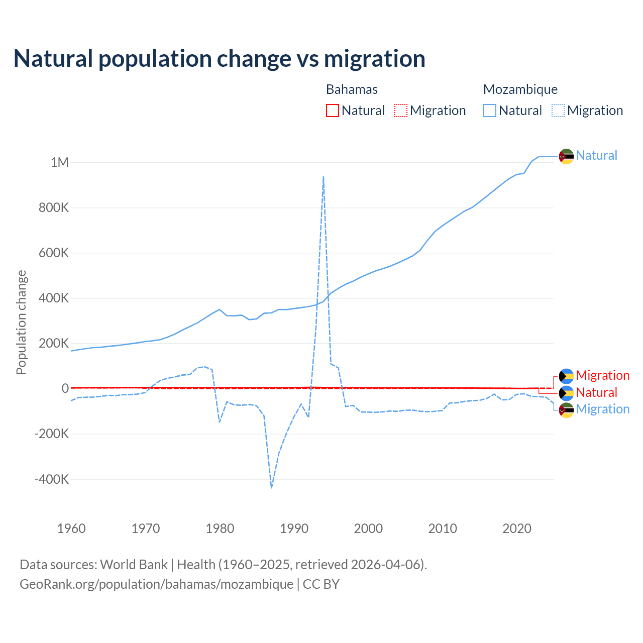 Over the last 10 years, 56.9% of the population change in the Bahamas is from natural causes (a gain of 11,209 people) and 43.1% is from migration (a gain of 8,495 people). In Mozambique 95.9% is from natural causes (a gain of 9,108,203 people) and 4.15% is from migration (a loss of 393,923 people).