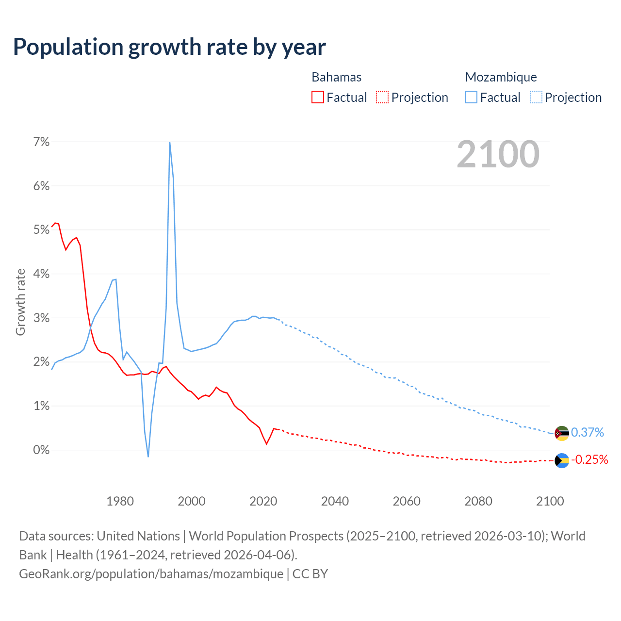 - For the last 10 years, the Bahamas has had an average growth rate of +0.52% per year vs +2.99% in Mozambique.