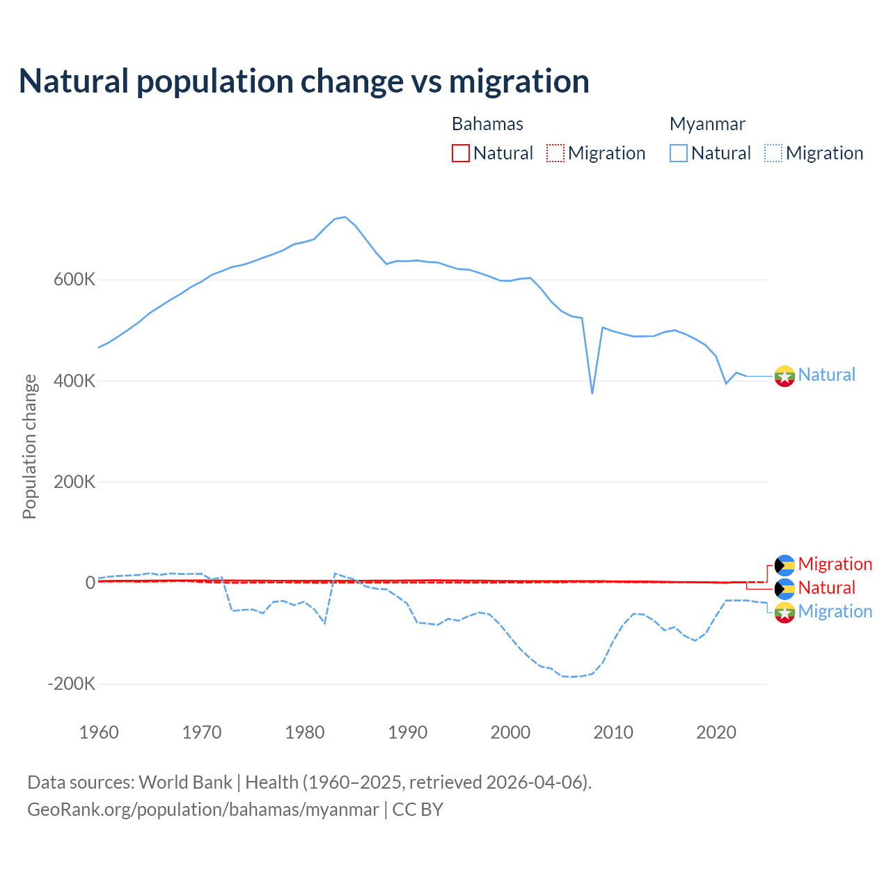 Over the last 10 years, 56.9% of the population change in the Bahamas is from natural causes (a gain of 11,209 people) and 43.1% is from migration (a gain of 8,495 people). In Myanmar 86% is from natural causes (a gain of 4,594,615 people) and 14% is from migration (a loss of 749,272 people).