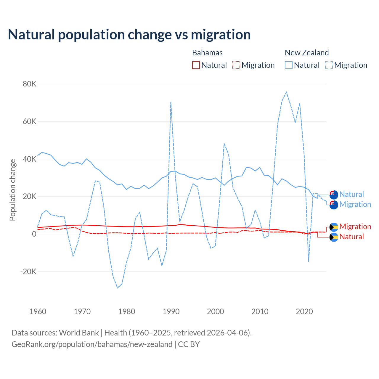 Over the last 10 years, 56.9% of the population change in the Bahamas is from natural causes (a gain of 11,209 people) and 43.1% is from migration (a gain of 8,495 people). In New Zealand 34.4% is from natural causes (a gain of 247,767 people) and 65.6% is from migration (a gain of 471,602 people).
