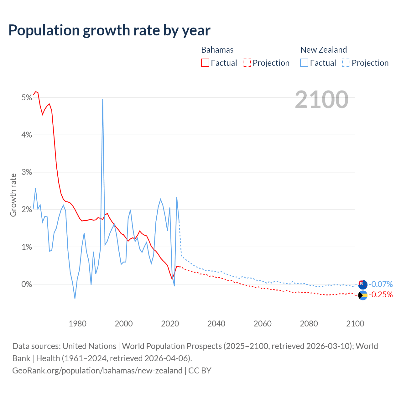 - For the last 10 years, the Bahamas has had an average growth rate of +0.52% per year vs +1.6% in New Zealand.