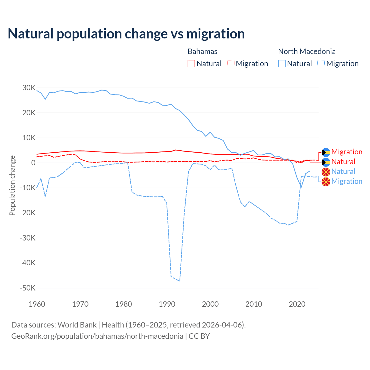 Over the last 10 years, 56.9% of the population change in the Bahamas is from natural causes (a gain of 11,209 people) and 43.1% is from migration (a gain of 8,495 people). In North Macedonia 6.45% is from natural causes (a loss of 12,585 people) and 93.5% is from migration (a loss of 182,429 people).