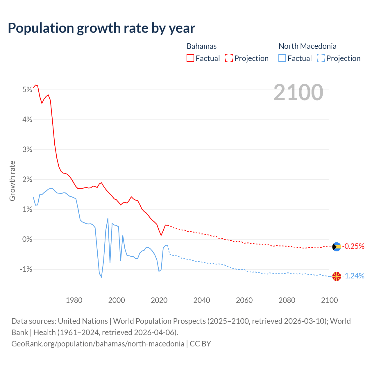 - For the last 10 years, the Bahamas has had an average growth rate of +0.52% per year vs -0.48% in North Macedonia.