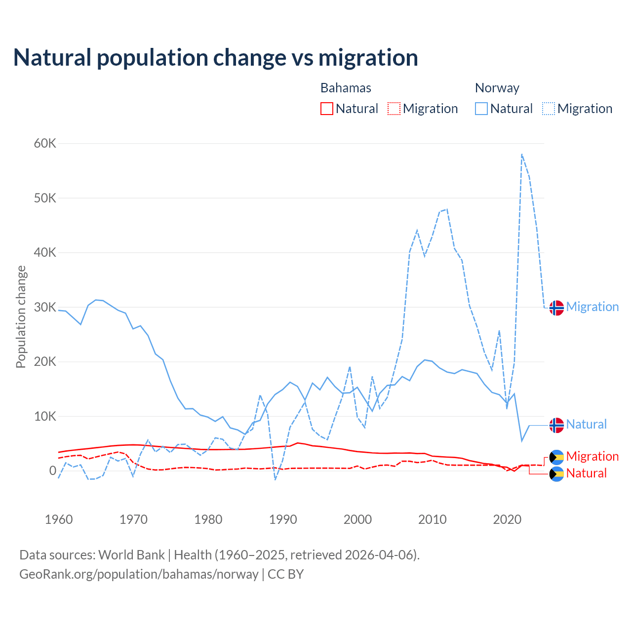 Over the last 10 years, 56.9% of the population change in the Bahamas is from natural causes (a gain of 11,209 people) and 43.1% is from migration (a gain of 8,495 people). In Norway 31.3% is from natural causes (a gain of 138,699 people) and 68.7% is from migration (a gain of 303,945 people).