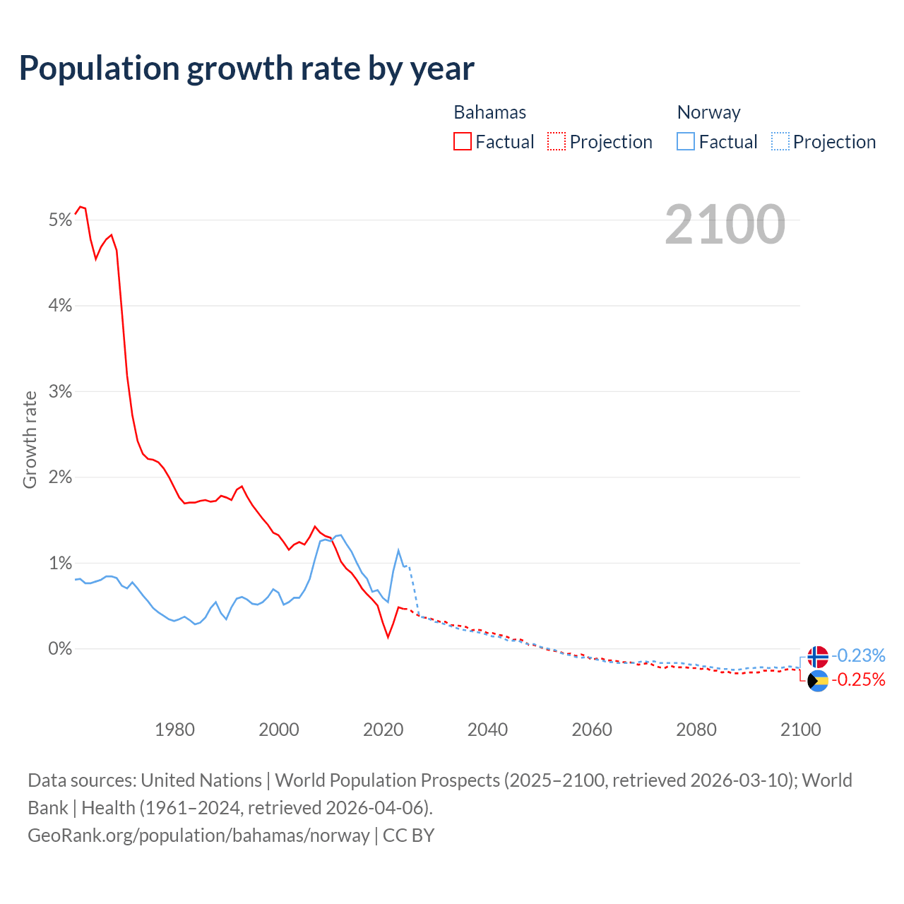 - For the last 10 years, the Bahamas has had an average growth rate of +0.52% per year vs +0.85% in Norway.