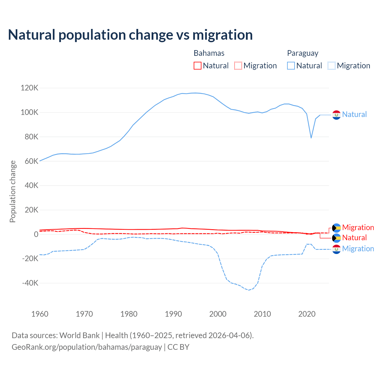 Over the last 10 years, 56.9% of the population change in the Bahamas is from natural causes (a gain of 11,209 people) and 43.1% is from migration (a gain of 8,495 people). In Paraguay 87.6% is from natural causes (a gain of 1,002,636 people) and 12.4% is from migration (a loss of 141,377 people).