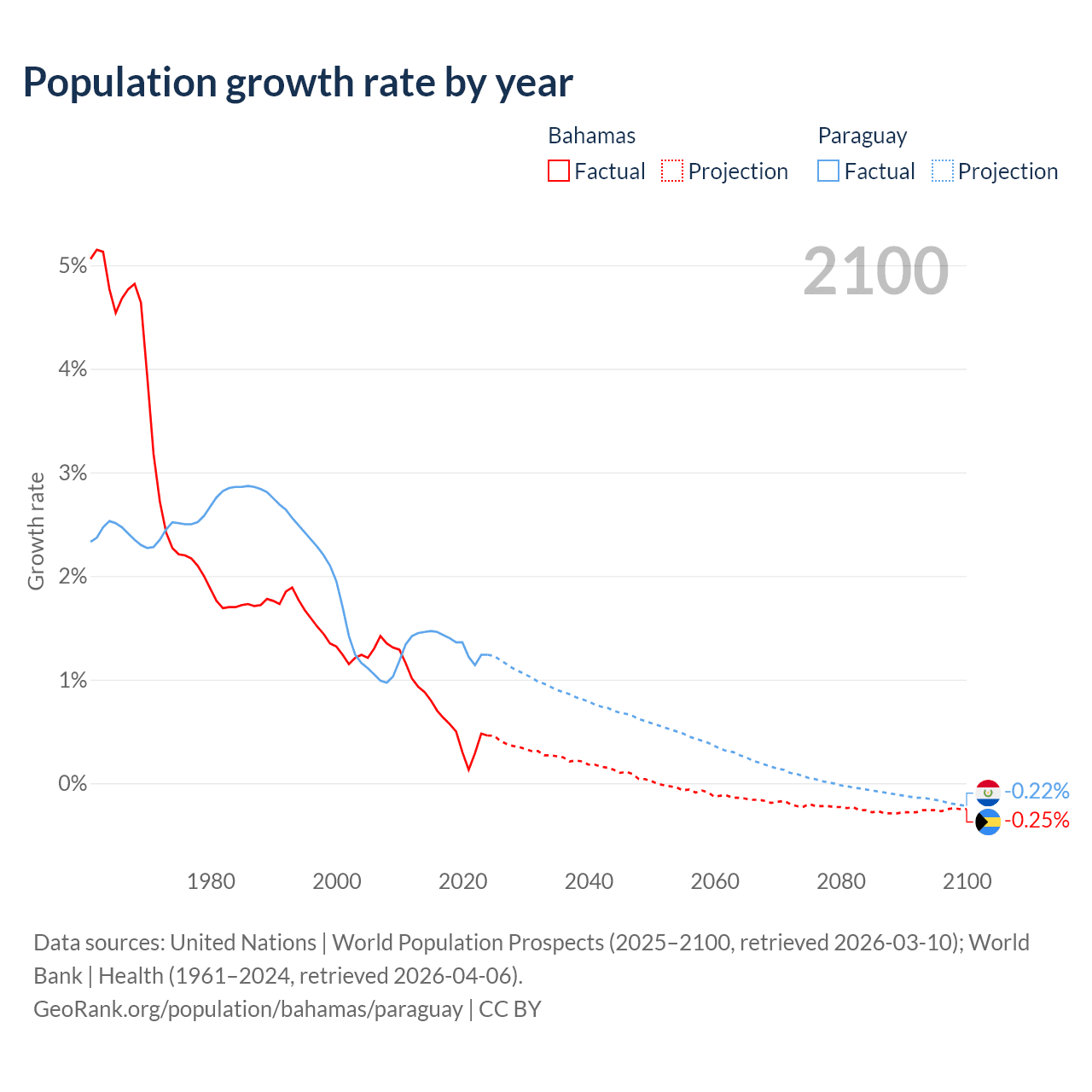 - For the last 10 years, the Bahamas has had an average growth rate of +0.52% per year vs +1.34% in Paraguay.