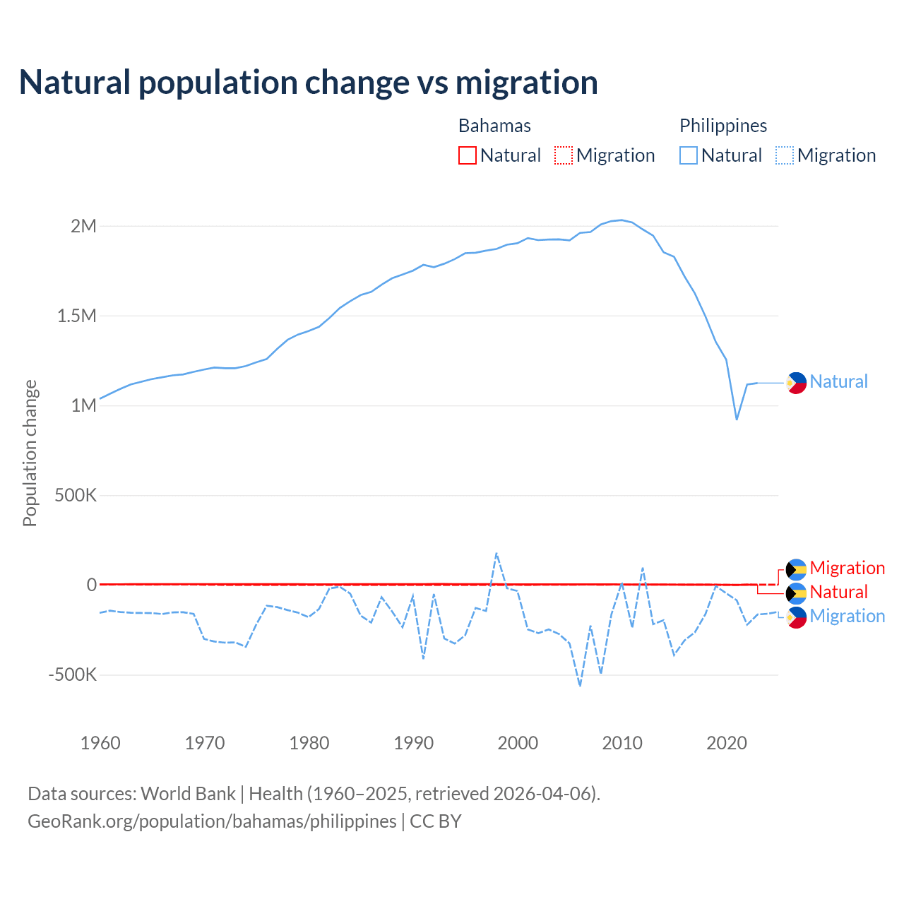 Over the last 10 years, 56.9% of the population change in the Bahamas is from natural causes (a gain of 11,209 people) and 43.1% is from migration (a gain of 8,495 people). In the Philippines 88.5% is from natural causes (a gain of 14,279,705 people) and 11.5% is from migration (a loss of 1,848,117 people).