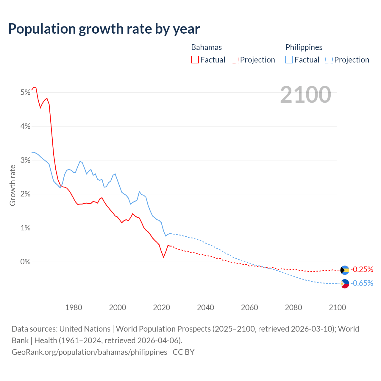 - For the last 10 years, the Bahamas has had an average growth rate of +0.52% per year vs +1.16% in the Philippines.