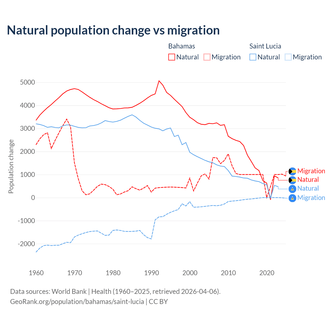 Over the last 10 years, 56.9% of the population change in the Bahamas is from natural causes (a gain of 11,209 people) and 43.1% is from migration (a gain of 8,495 people). In Saint Lucia 95.7% is from natural causes (a gain of 6,039 people) and 4.31% is from migration (a loss of 272 people).