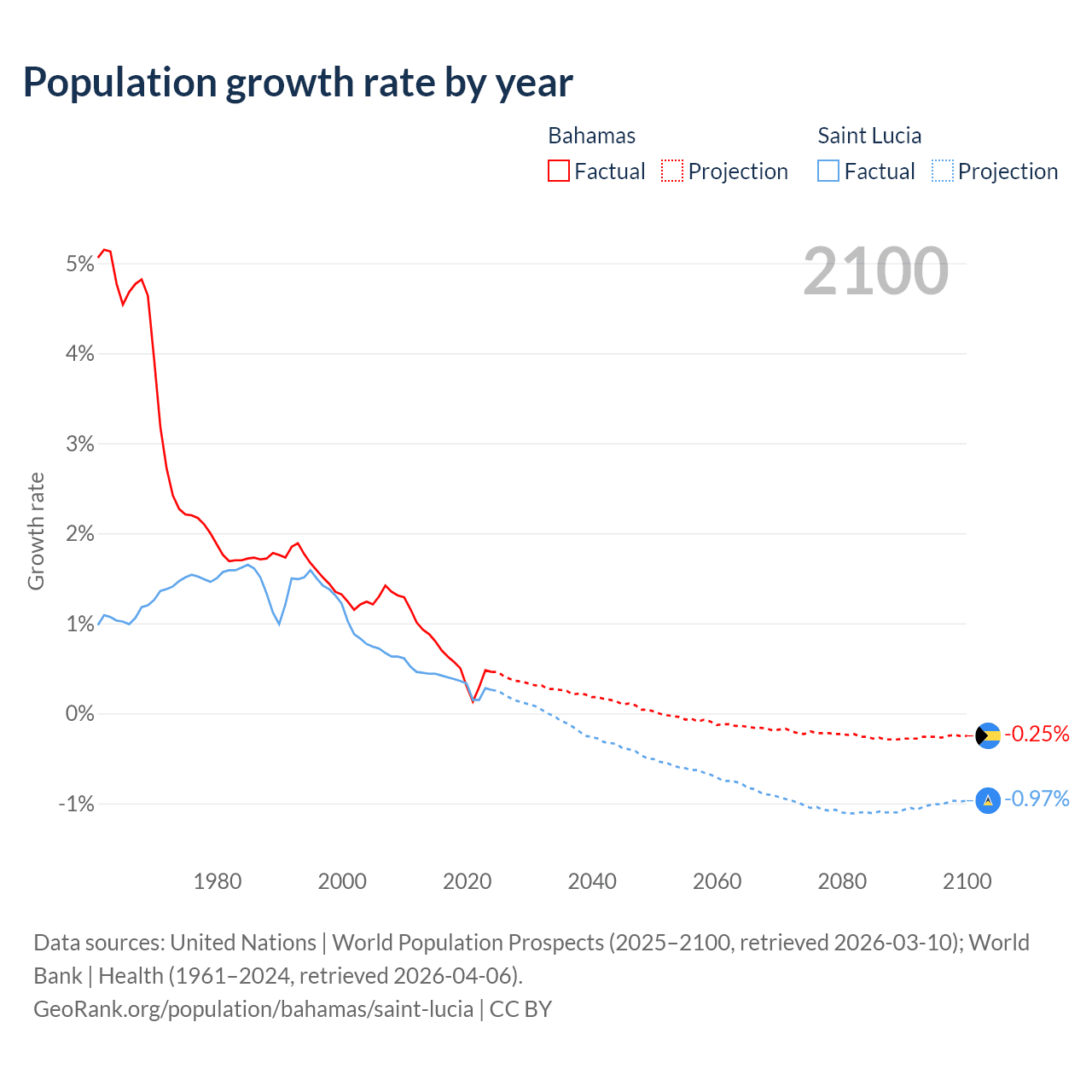 - For the last 10 years, the Bahamas has had an average growth rate of +0.52% per year vs +0.33% in Saint Lucia.