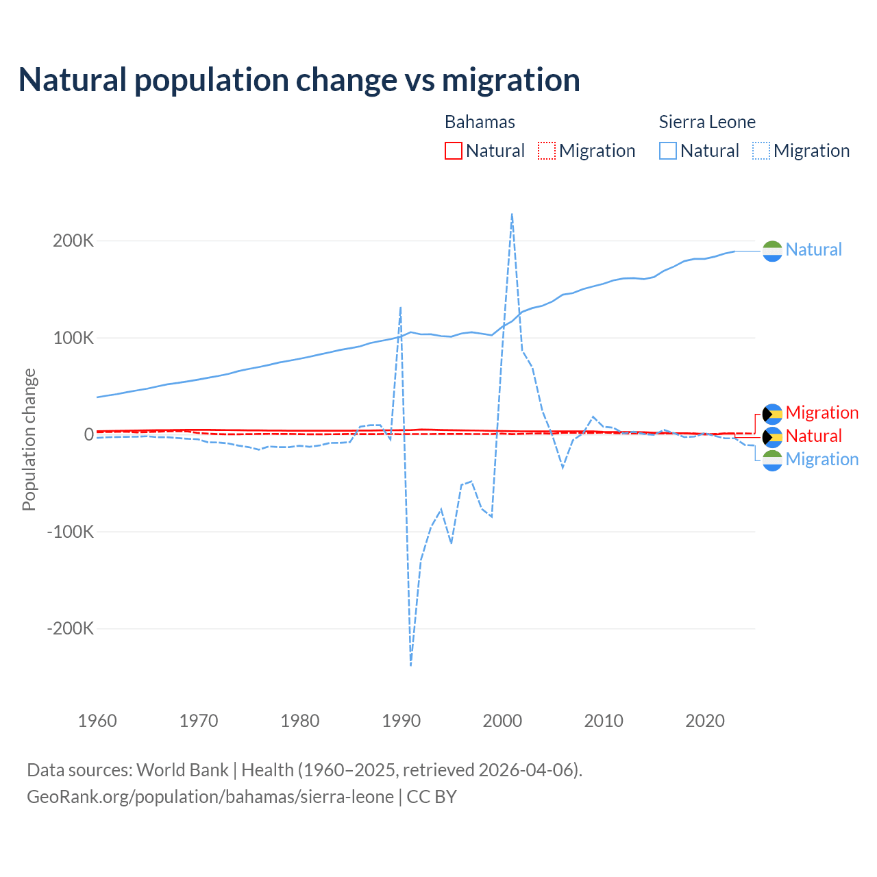 Over the last 10 years, 56.9% of the population change in the Bahamas is from natural causes (a gain of 11,209 people) and 43.1% is from migration (a gain of 8,495 people). In Sierra Leone 99.6% is from natural causes (a gain of 1,764,049 people) and 0.41% is from migration (a loss of 7,211 people).
