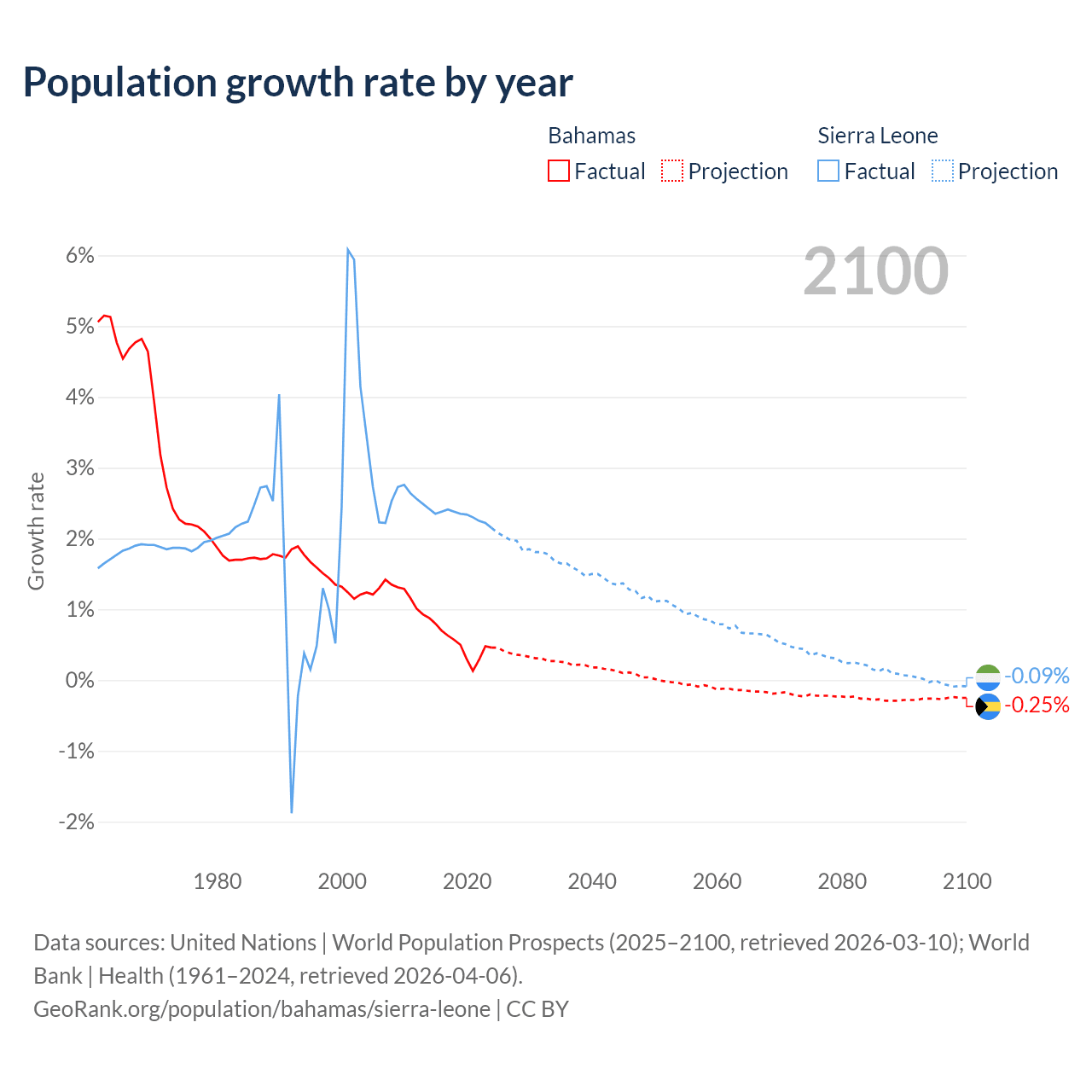 - For the last 10 years, the Bahamas has had an average growth rate of +0.52% per year vs +2.32% in Sierra Leone.