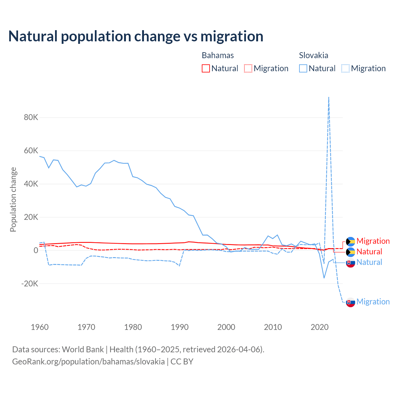 Over the last 10 years, 56.9% of the population change in the Bahamas is from natural causes (a gain of 11,209 people) and 43.1% is from migration (a gain of 8,495 people). In Slovakia 7.47% is from natural causes (a loss of 8,728 people) and 92.5% is from migration (a gain of 108,156 people).