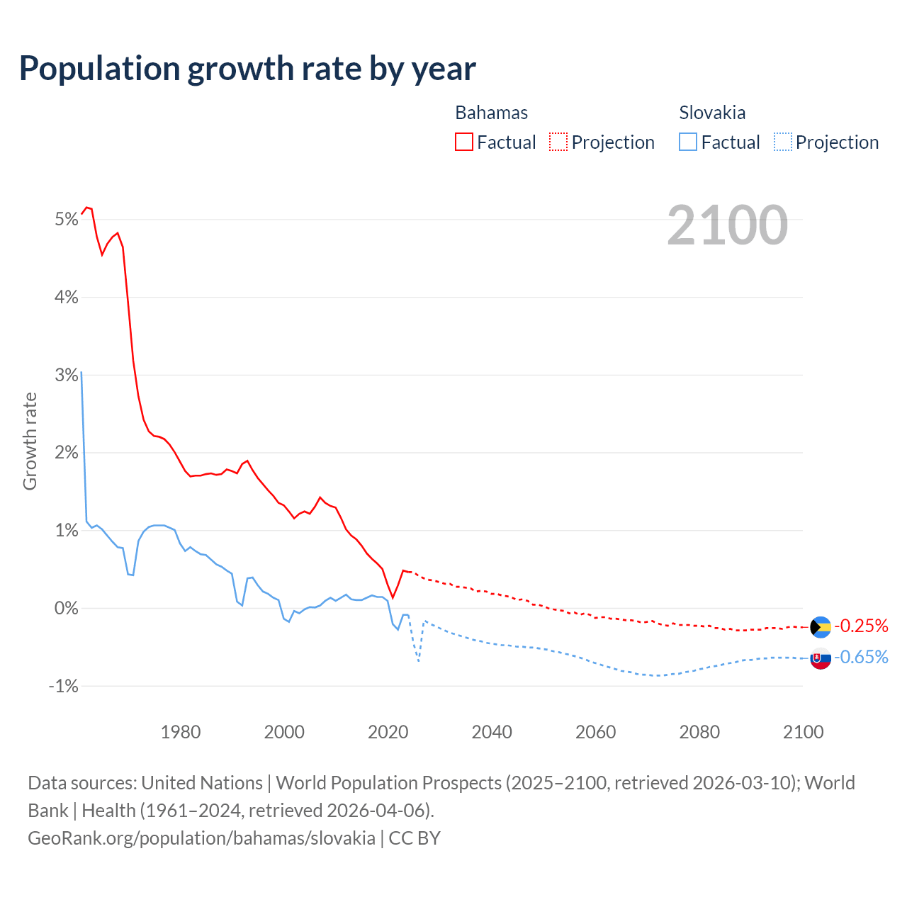 - For the last 10 years, the Bahamas has had an average growth rate of +0.52% per year vs +0.01% in Slovakia.