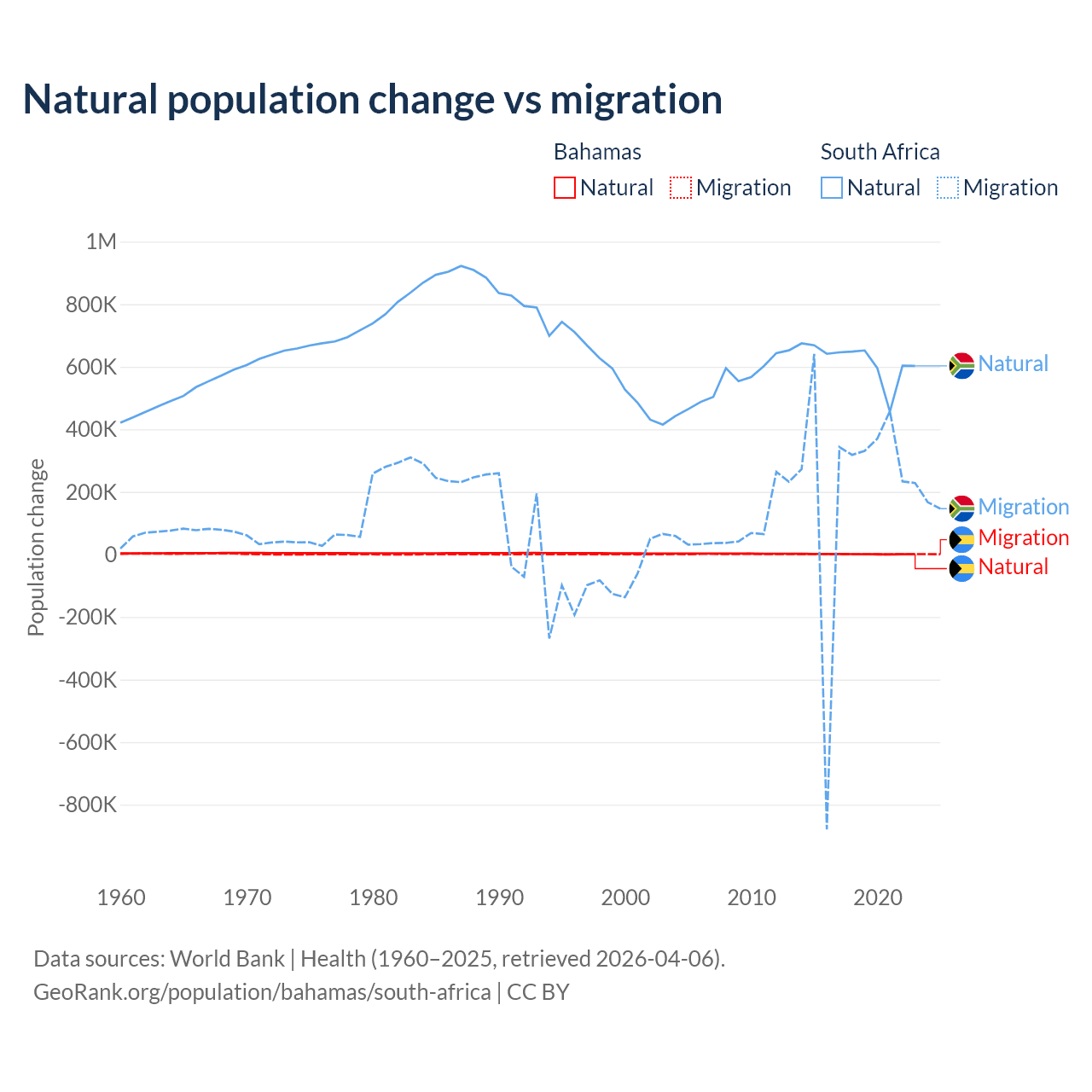 Over the last 10 years, 56.9% of the population change in the Bahamas is from natural causes (a gain of 11,209 people) and 43.1% is from migration (a gain of 8,495 people). In South Africa 72.8% is from natural causes (a gain of 6,190,027 people) and 27.2% is from migration (a gain of 2,316,795 people).