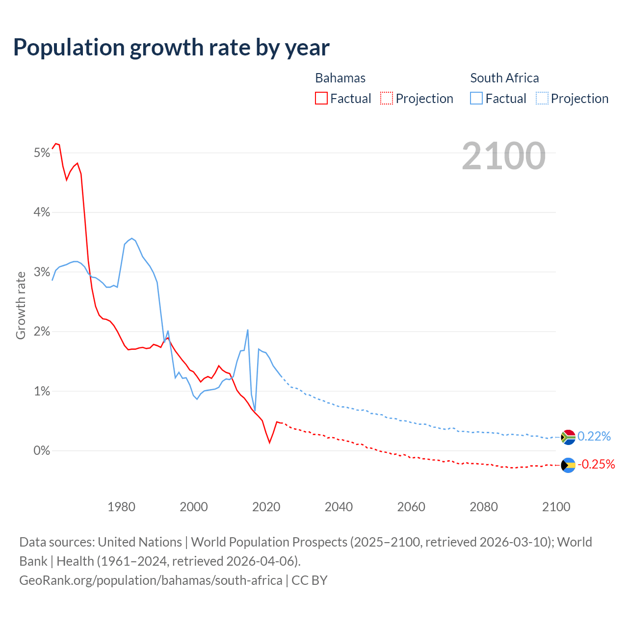 - For the last 10 years, the Bahamas has had an average growth rate of +0.52% per year vs +1.44% in South Africa.