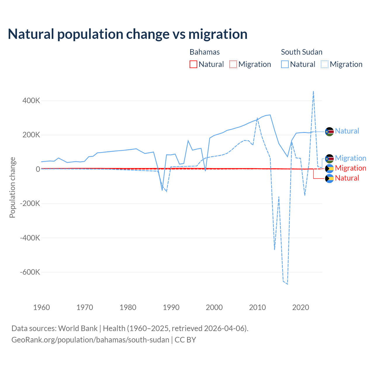 Over the last 10 years, 56.9% of the population change in the Bahamas is from natural causes (a gain of 11,209 people) and 43.1% is from migration (a gain of 8,495 people). In South Sudan 57.4% is from natural causes (a gain of 1,792,135 people) and 42.6% is from migration (a loss of 1,329,606 people).