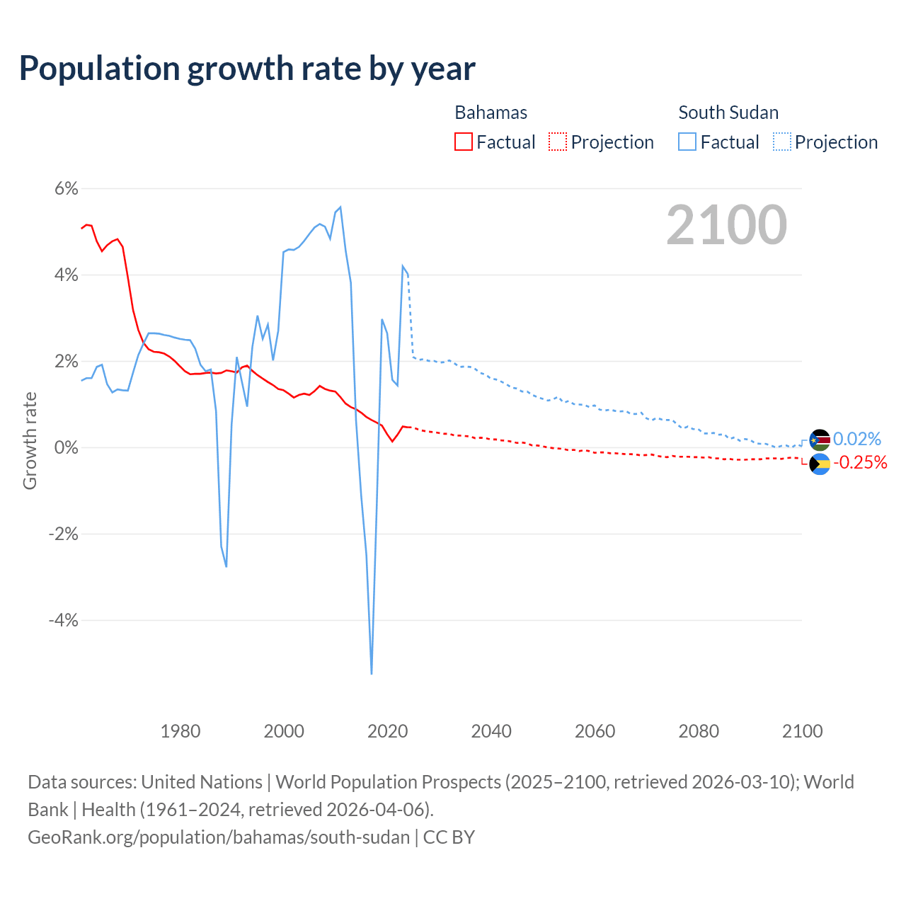- For the last 10 years, the Bahamas has had an average growth rate of +0.52% per year vs +0.65% in South Sudan.