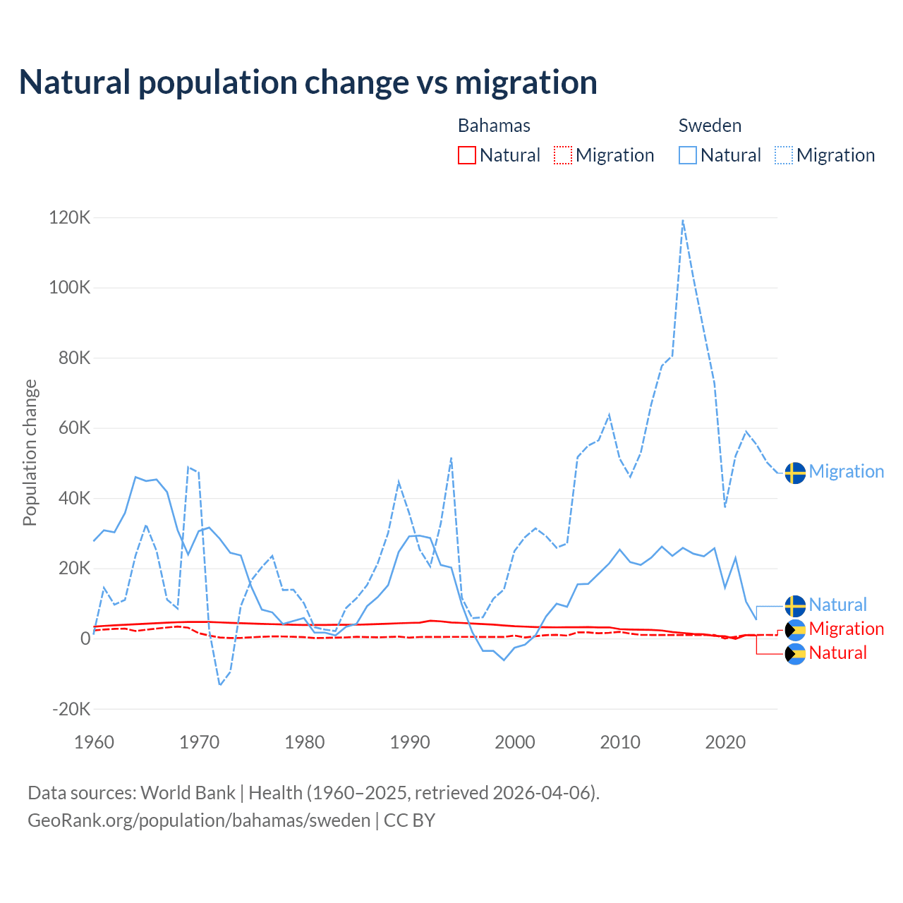 Over the last 10 years, 56.9% of the population change in the Bahamas is from natural causes (a gain of 11,209 people) and 43.1% is from migration (a gain of 8,495 people). In Sweden 21.4% is from natural causes (a gain of 201,900 people) and 78.6% is from migration (a gain of 743,642 people).