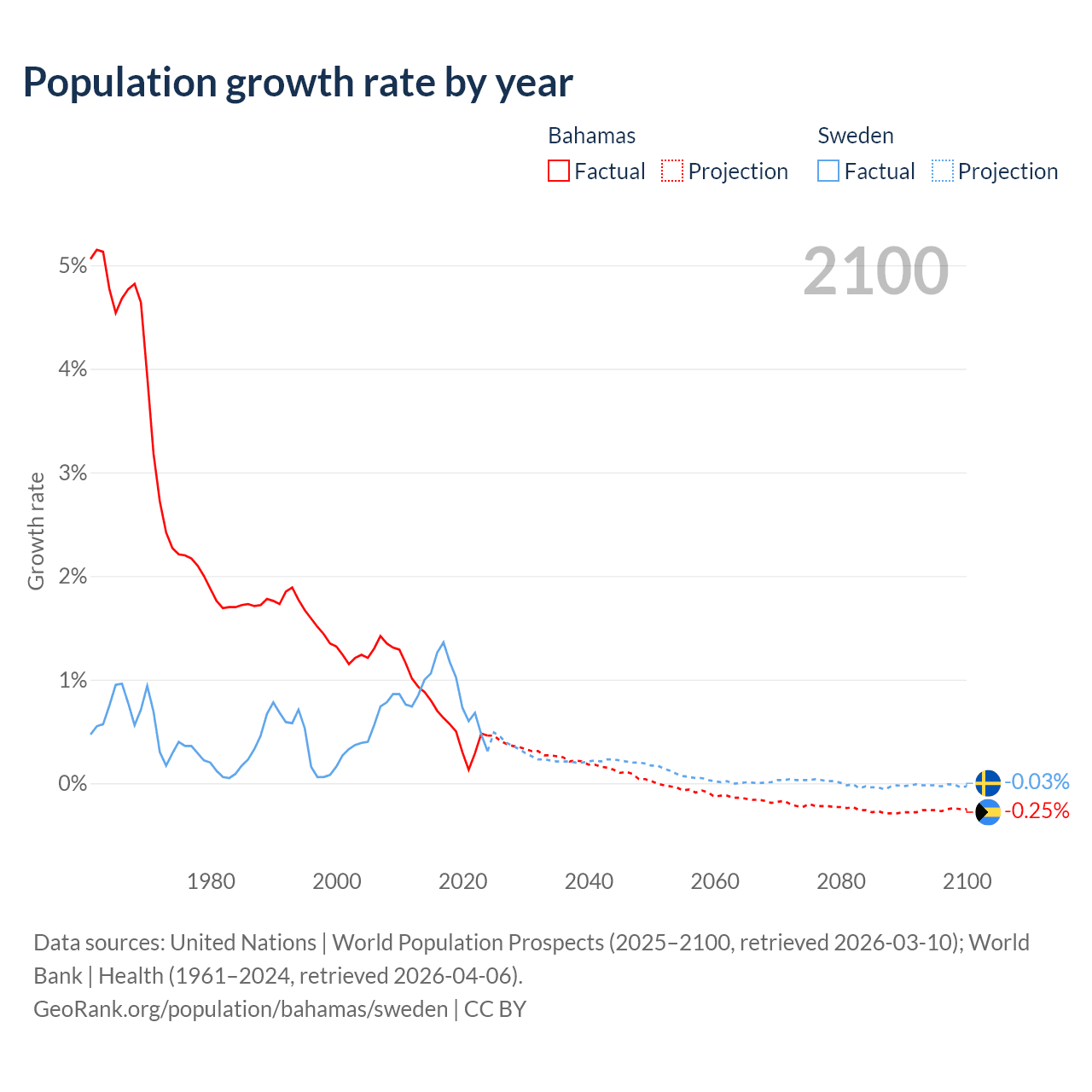 - For the last 10 years, the Bahamas has had an average growth rate of +0.52% per year vs +0.88% in Sweden.