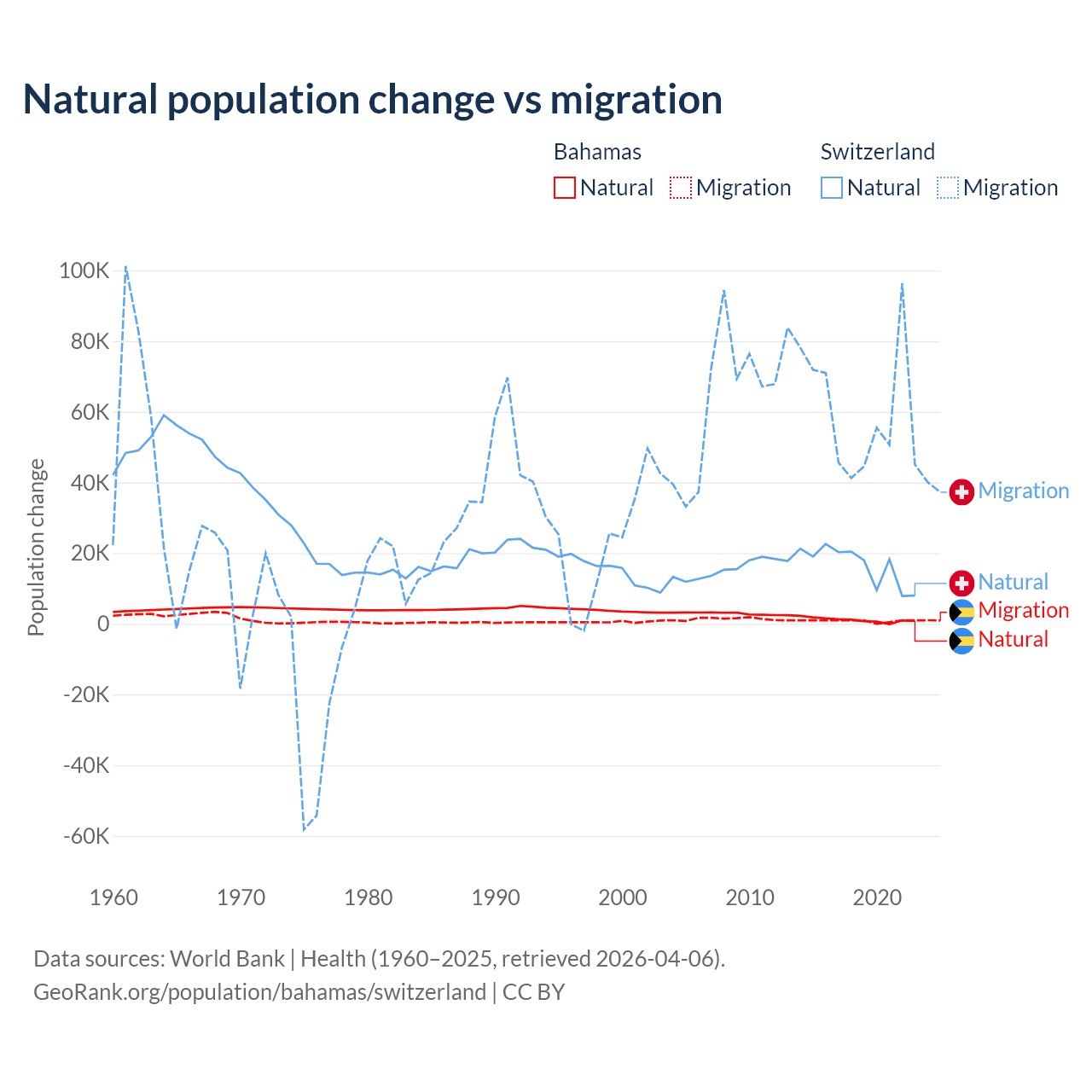 Over the last 10 years, 56.9% of the population change in the Bahamas is from natural causes (a gain of 11,209 people) and 43.1% is from migration (a gain of 8,495 people). In Switzerland 21.6% is from natural causes (a gain of 165,354 people) and 78.4% is from migration (a gain of 600,145 people).