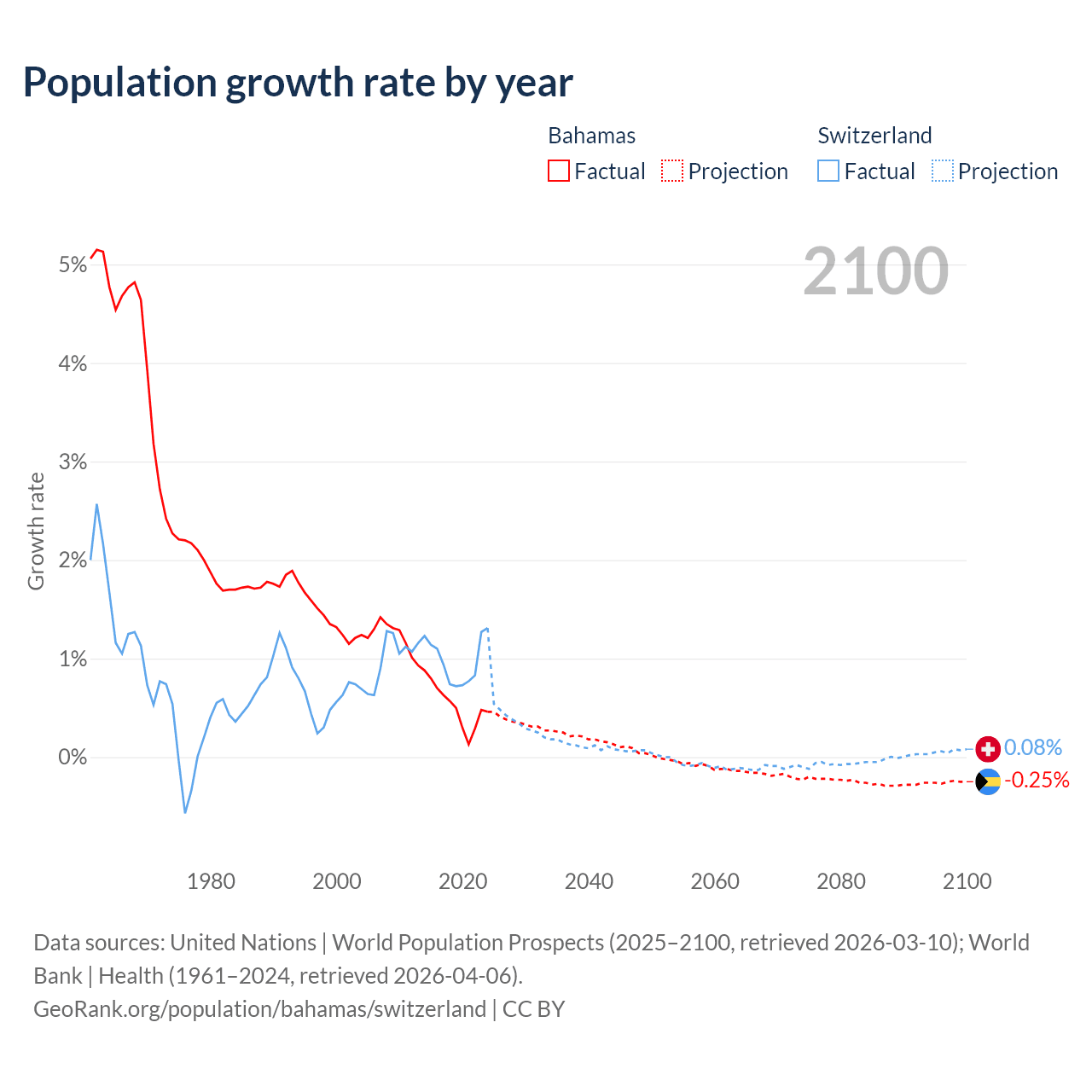 - For the last 10 years, the Bahamas has had an average growth rate of +0.52% per year vs +0.98% in Switzerland.